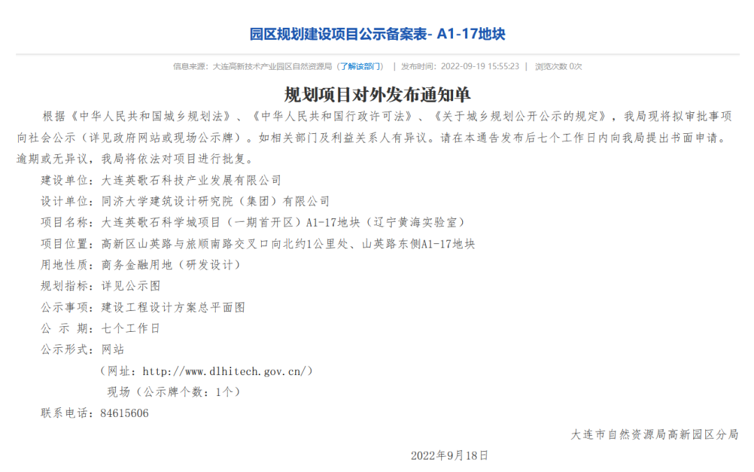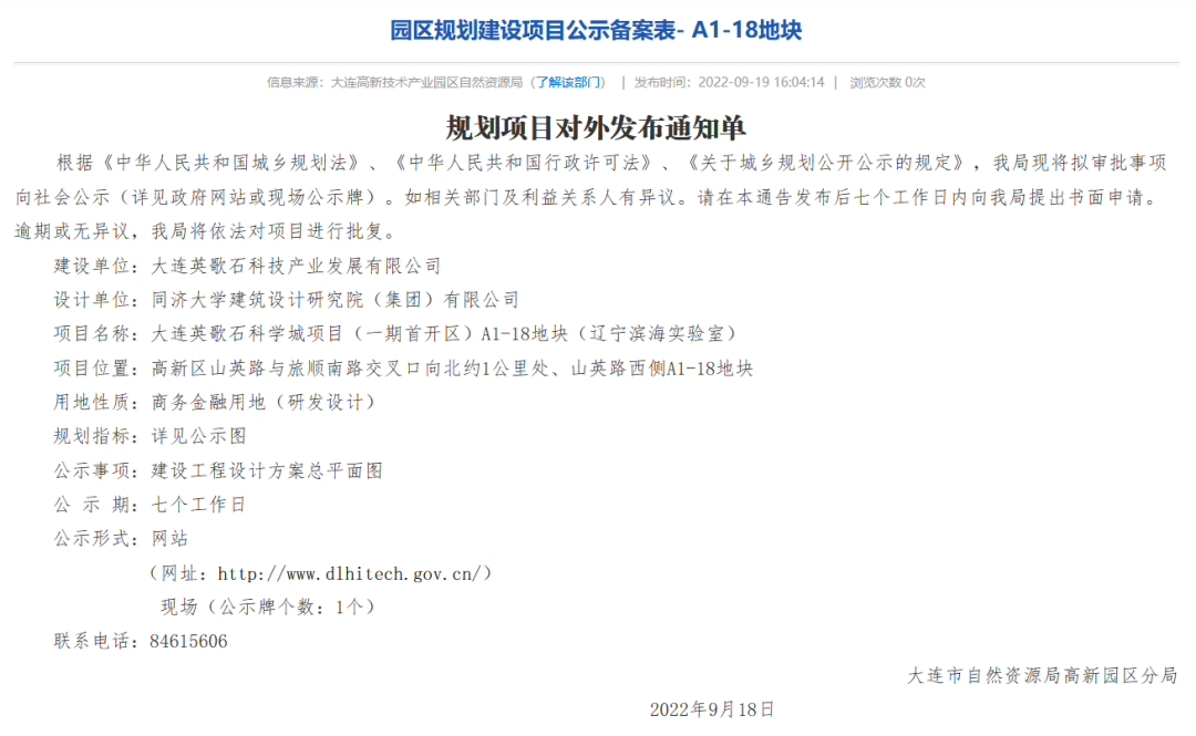 大连英歌石科学城项目(一期首开区)A1-17地块(辽宁黄海实验室)、大连英歌石科学城项目(一期首开区)A1-18地块(辽宁滨海实验室)规划已公示。