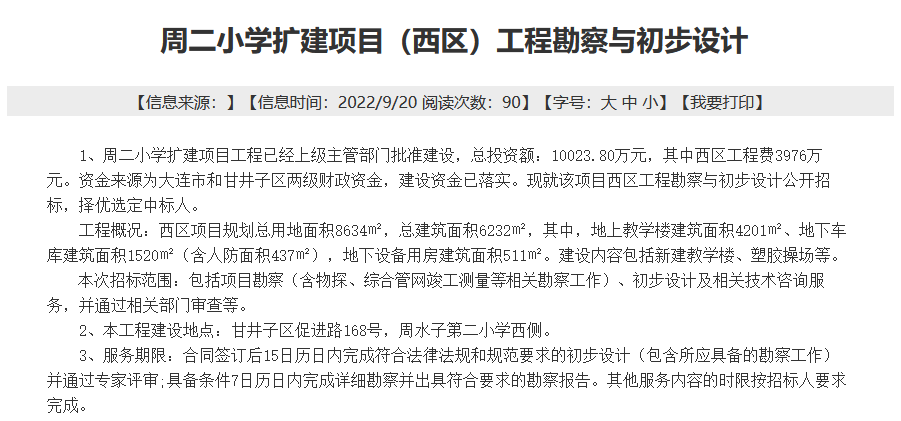 周二小学拟扩建,总投资额为10023.80万元,项目(西区)工程勘察与初步设计正在招标,招标范围包括项目勘察(含物探、综合管网竣工测量等相关勘察工作)、初步设计及相关技术咨询服务,并通过相关部门审查等。