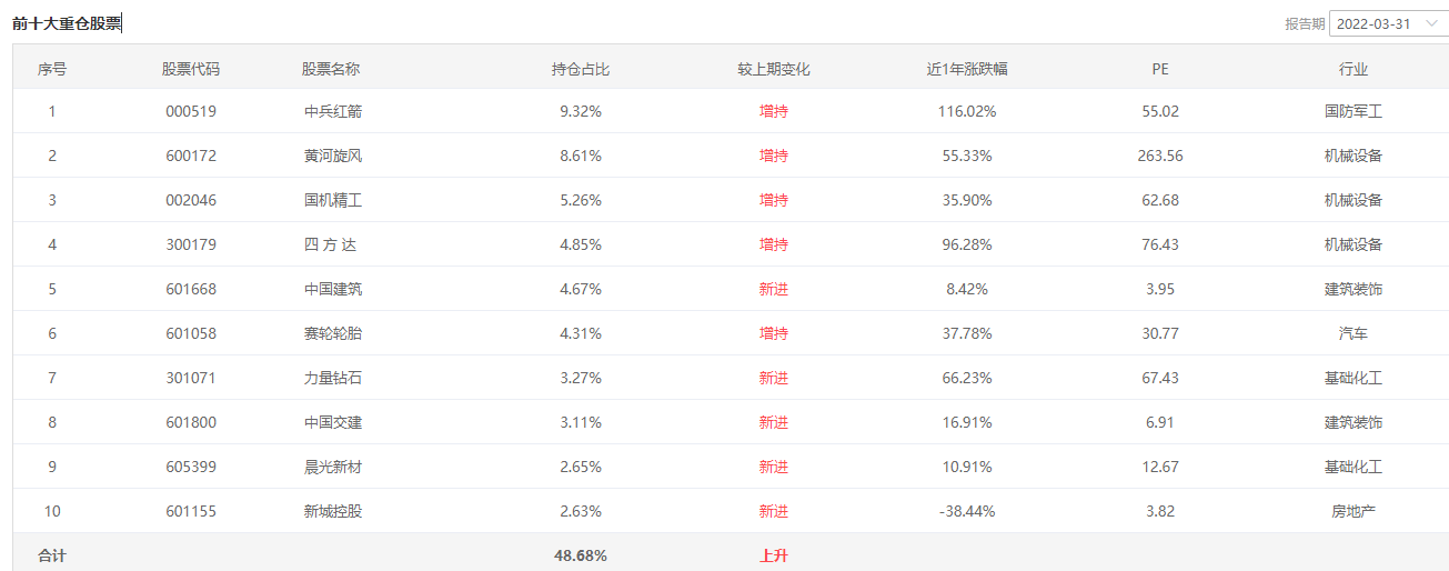 以代表产品为例,根据基金定期报告显示,重仓行业分布主要在基础化工、机械、国防军工配置比例均值较高,分别为30.51%、16.92%和10.12%,而最新一期的重仓持股中,轻工制造、机械、有色金属的配置比例较高。这也与李淑彦在研究员时期专攻的领域息息相关。