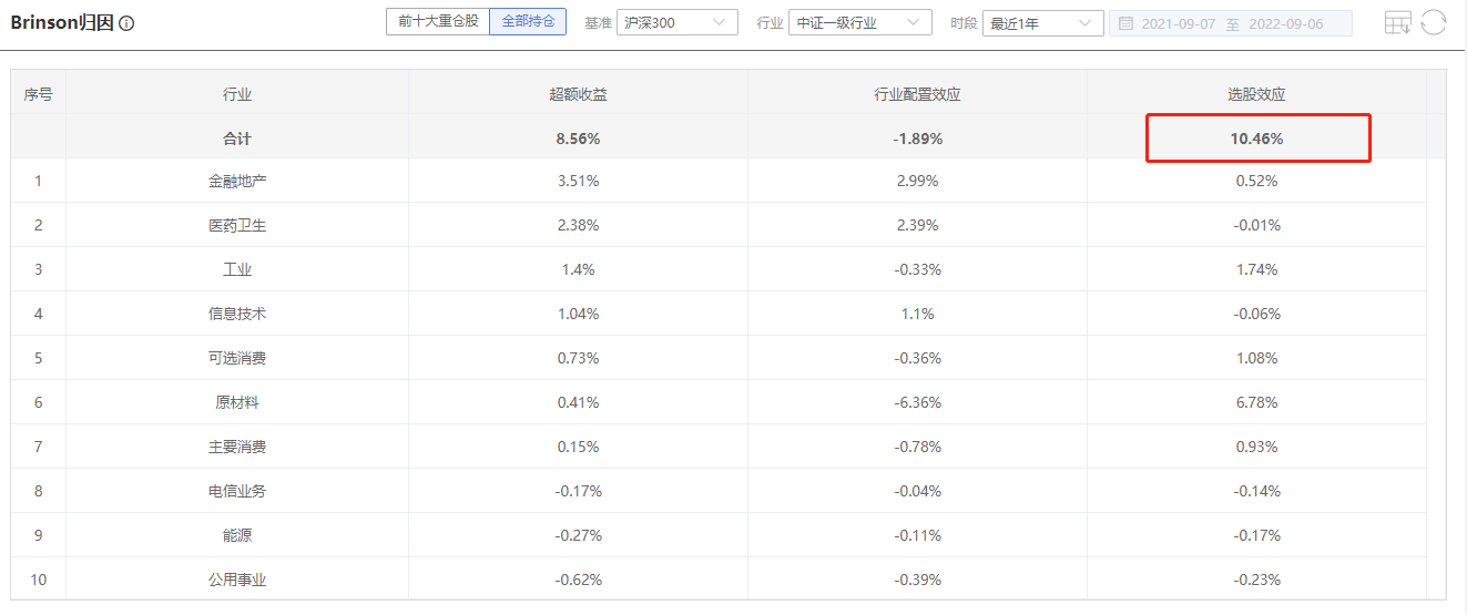 如果采用Brinson业绩归因的方法,将基金的超额收益拆解到行业配置效应和选股效应上来,可以看出杨金金的超额收益几乎全部来自于选股收益。