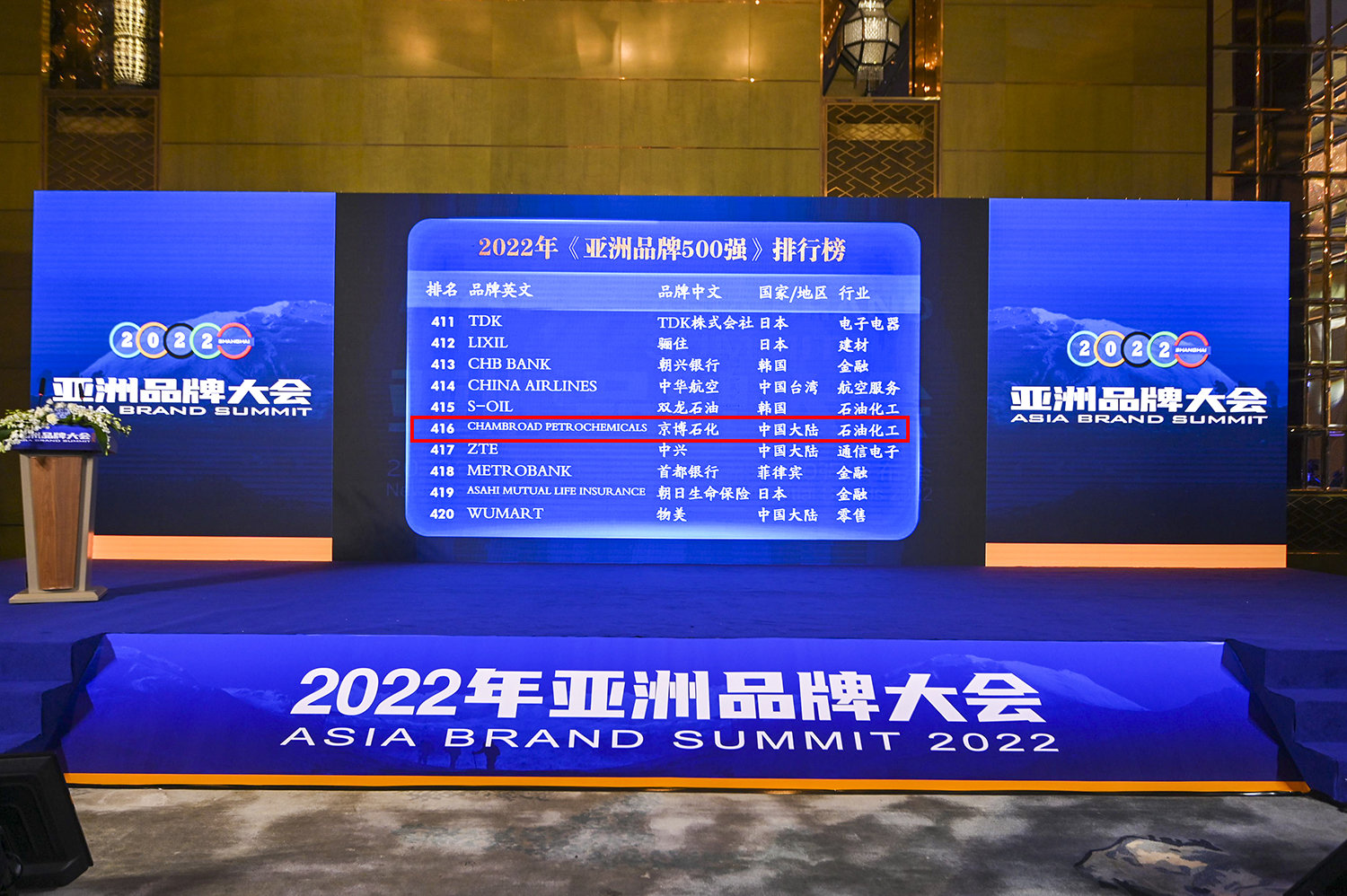 9月22日,由世界品牌实验室(World Brand Lab)主办的亚洲品牌大会暨亚洲品牌500强发布会在上海盛大启幕,大会以“亚洲品牌如何在全球经济动荡中崛起”为主题。会上,专家组委会发布“2022亚洲品牌500强”榜单,山东京博石油化工有限公司榜上有名,位列第416位。