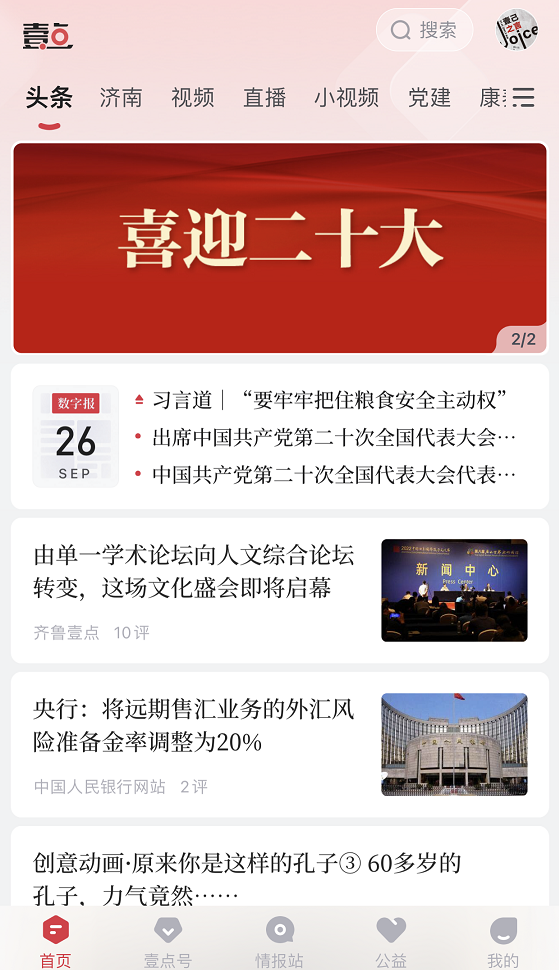 此次10.0版本进行了全面改版,从整体布局、明暗色调、字体细节等多个方面展现齐鲁壹点新气象、新风尚。将头条重要的三条新闻放在同一个卡面格内,清晰明了,同时将原来的黑色粗大的字体换成宋体,取消原有每条新闻之间的线条式间隔线,采用了全新的卡片式风格和毛玻璃效果,给人焕然一新的视觉交互体验。此外,此次版本升级还将三大核心业务板块壹点号、情报站、壹点公益入口集中布局在底端,产品开放程度更高,用户点击即可进入相关界面,方便快捷。