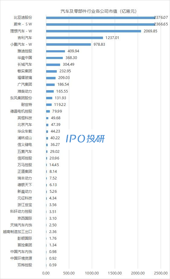 3、市值最高的是比亚迪股份(01211.HK),市值为2376.07亿元;市值最低的是双桦控股(01241.HK),市值为0.59亿元。