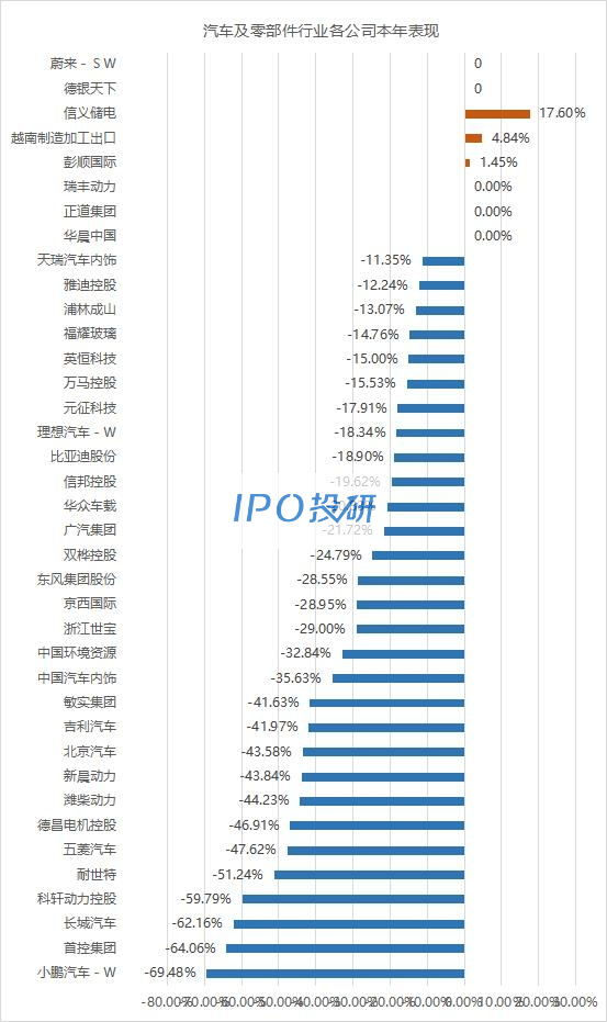 本年涨幅最大的是信义储电(08328.HK),涨幅17.60%;跌幅最大的是小鹏汽车-W(09868.HK),跌幅为-69.48%。