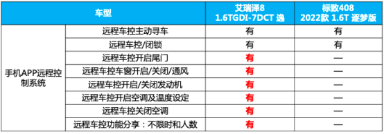 艾瑞泽8远程操控系统的功能也比标致408要丰富,通过手机APP便可轻松操控车辆。早上出门前,可提前通过手机开启空调、天窗,营造最舒适的驾乘环境。如果车停在像万达、国贸这样的商圈停车场时,通过手机APP便可远程主动寻车,再也不用担心找不到车。