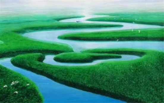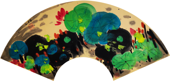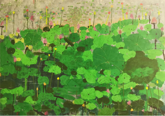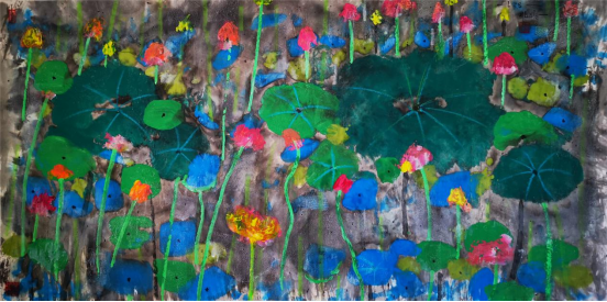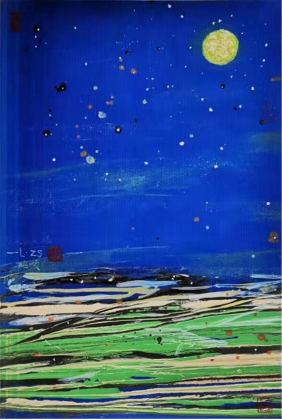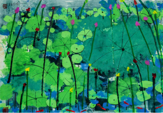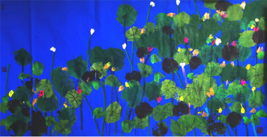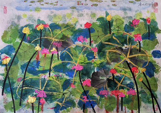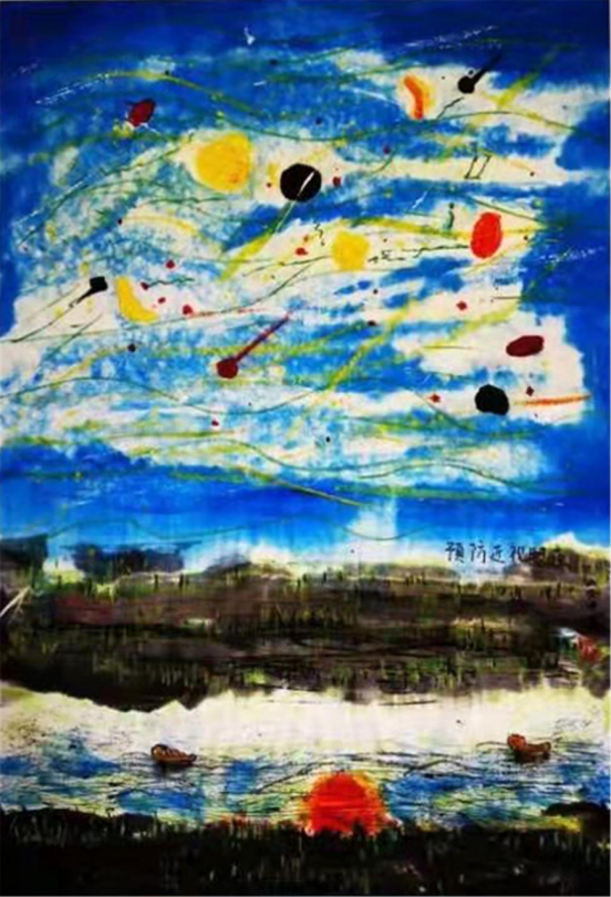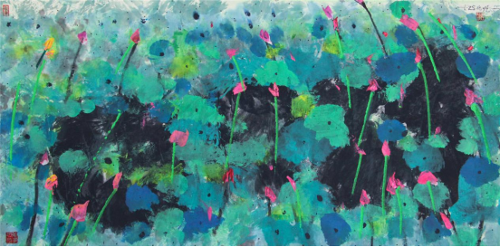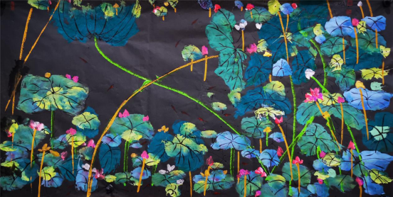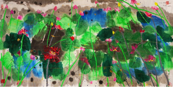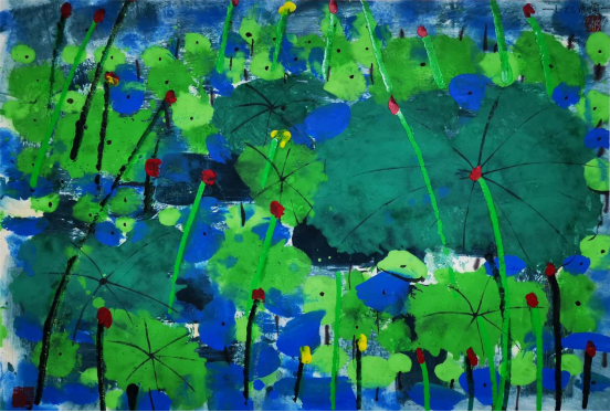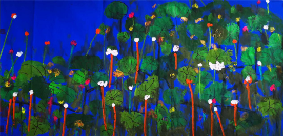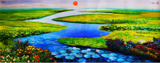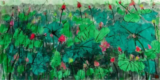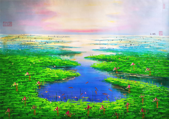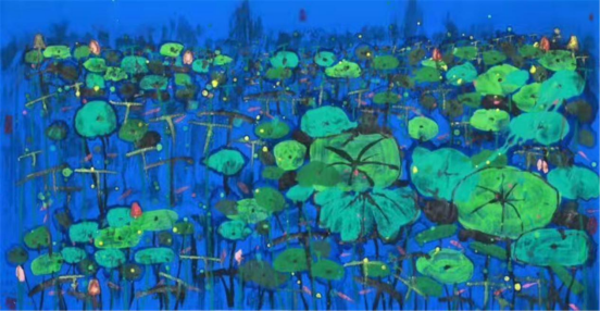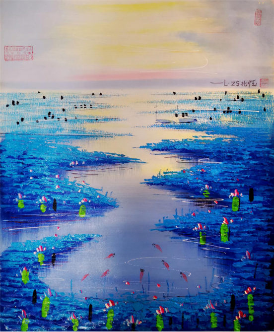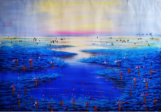 一幅幅“兆顺波画”横空出世,《荷塘盛世》,天蓝水碧,叶绿花红,意境深远,赏心悦目,令人赏心悦目,顿生恬逸淡泊之情;《天光荷影共俳徊》,碧荷澄水,蓝天白云,清气荡漾,韵味悠然,生机无限,引人步入佛意禅境。《蓝色畅想曲》,将线条之美、色彩之美、韵律之美聚于一体,交相辉映,使人激情喷发,创造欲望升腾……执著求索的羁旅,似徜徉于智慧的长河,李兆顺用画笔敲开了激发右脑潜能之门。