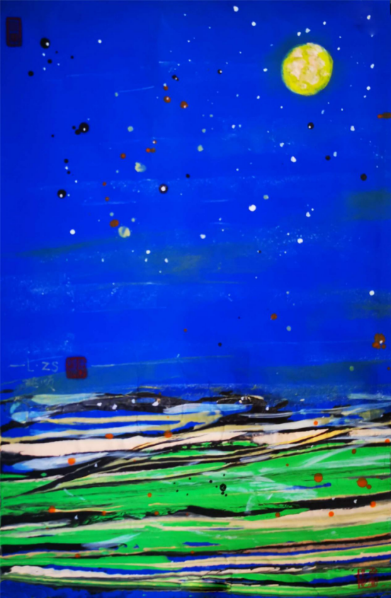 足迹曾踏遍诸多名山大川的李兆顺,往日的游历积累,在灵感的撩拨中又一个个跳跃在脑海里。他又进入创作的全新状态,在握起画笔之时,登临绝顶的情怀催动他在画技上进行新的创新:让右脑激发画不仅具有了抽象的意味和空间虚实的利用,而且创造一个具有抒情意味的、充满诗意的宇宙空间。他在点、线、面的相互交织中努力营造思想与情感世界的节奏和韵律,让赏画者在尽享“绿水青山”之美的同时,感悟到思想、道德、情怀的力量。在《天光荷影》、《蓝色之梦》中,云天、长河、草地、荷塘演奏出一曲美妙的旋律,传递出一种和谐、温雅、清透的气息。书画评论家刘曦林认为,李兆顺以多次滴彩积色,形成多层次的冷暖及丰富的格调,融自然之万象,创作出独特意境风格,为大众提供着优美的精神食粮。
