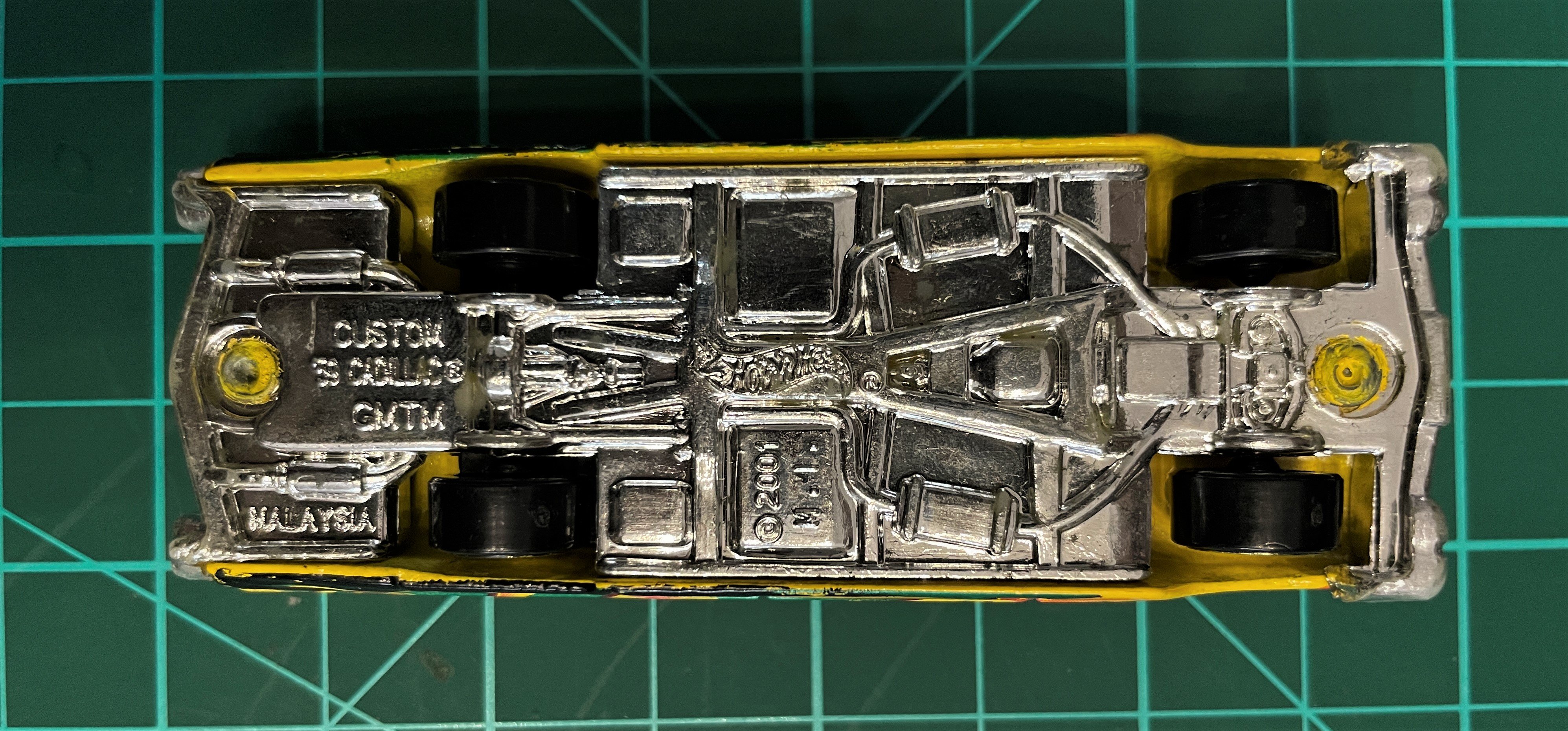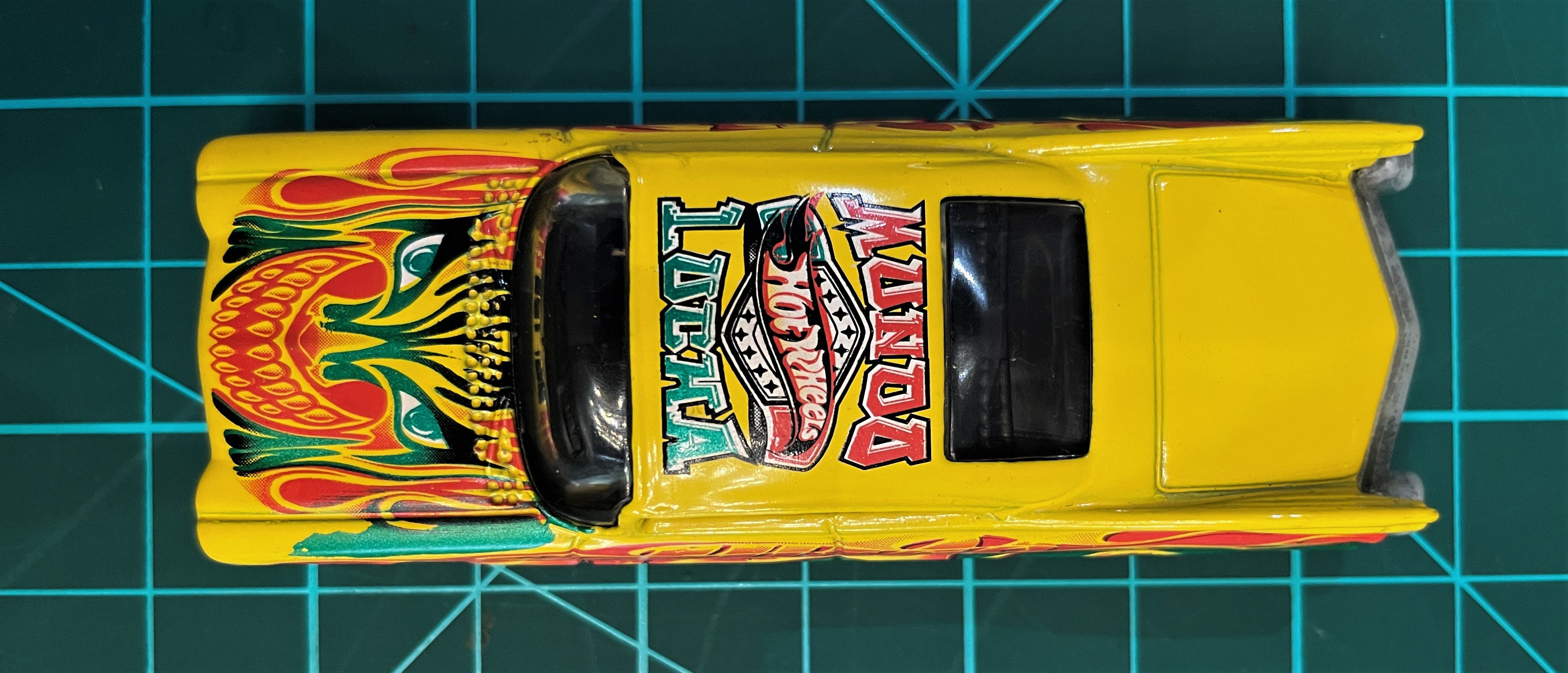 这款摔跤手系列车身整体涂装只能用“番茄炒蛋”来形容,整个引擎盖是一个摔跤手面具(Luchador Face),顶部就是动画片《mucha lucha》加“HotWheels”的组合涂装。侧面火焰涂装里藏着西班牙单词“El Fuego”(火焰),反正我是没看出来,感觉官方是用这款车来测色盲的。