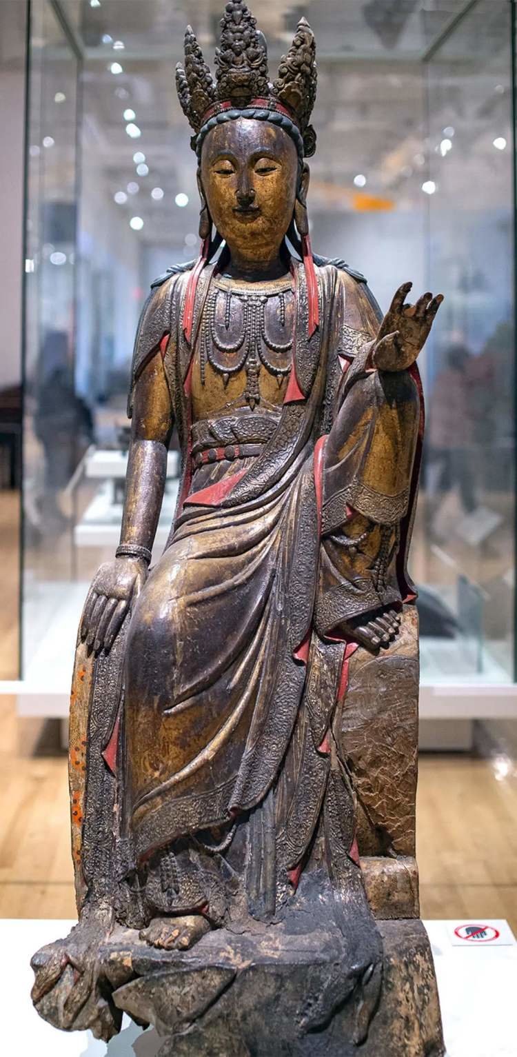 此像被誉为最壮观的水月观音。博物馆给予极高展陈礼遇,为其搭配山西广胜寺壁画《炽盛光佛佛会图》,北京智化寺万佛阁的明代楠木藻井,以及北京清代宅院的雕花格扇门,陈设于“中国庙宇”展廊中间。