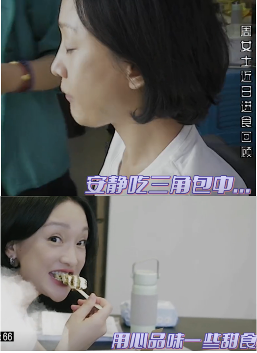 视频还表示,周迅近几日饮食当中,碳水占比非常大,私下总会偷偷吃东西,无论是一边化妆一边吃三角面包,还是拍摄间隙吃甜食,都看起来像偷吃的孩子,十分可爱。