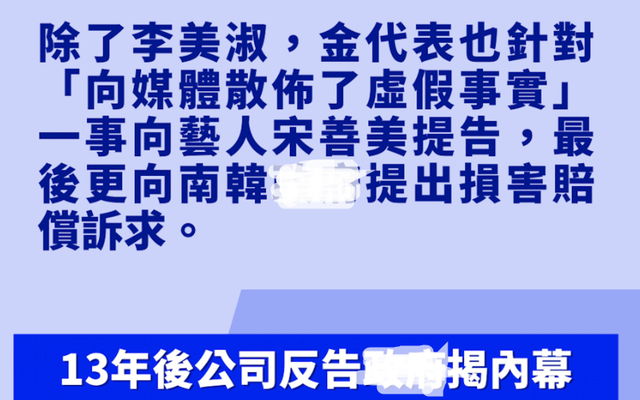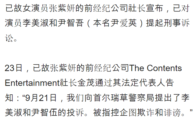 9月23日,金代表又通过律师对外发布声明,表示已经针对李美淑以及女星尹智吾提起刑事诉讼,指控她们企图欺诈和诽谤。