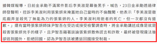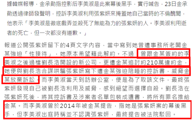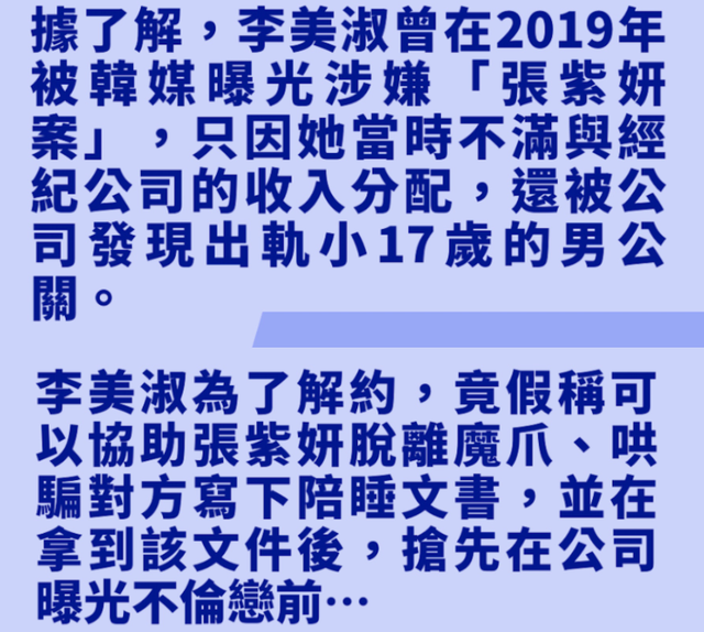 针对李美淑在张紫妍案件中所处的角色,媒体也有过详细报道,她多少牵扯其中,一直有说法是她诱骗张紫妍写下遗书,但只是为了拿住把柄想要和公司解约,张紫妍意识到受骗后十分痛苦,不久后就走上了绝路。