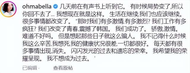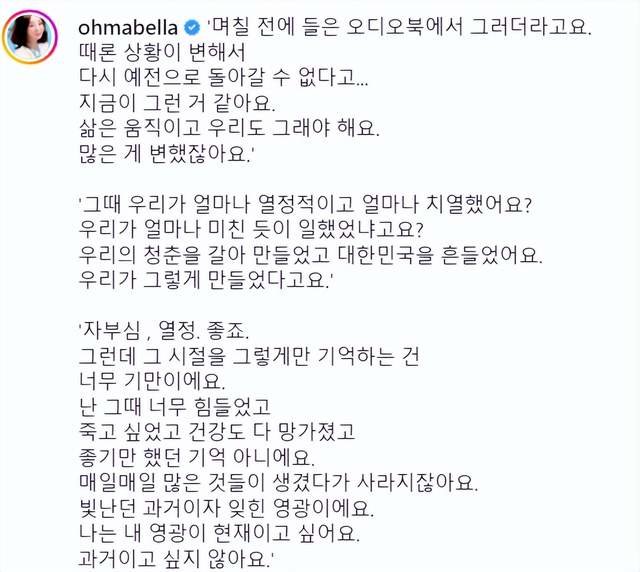 之后一大段话应该是尹智吾对有声书内容的引用,越看越有深意:那时候我们有多激情,有多激烈?我们的工作有多疯狂……但想起来那些日子就这么骗人,我不记得什么时候我这么辛苦,我想死,我的健康状况很差……闪闪发光的过去和遗忘的荣幸,我希望我的荣耀呈现,我不想成为过去。