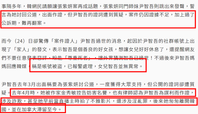 出面作证后的尹智吾也很快陷入麻烦,又是被指利用张紫妍敛财,又是被曝不雅视频遭到调查,还被起诉欺诈、损害名誉、要求返还捐款等等,到了最后尹智吾干脆离开韩国,跑到加拿大定居,一度传出离世消息,还好最后确认是乌龙。