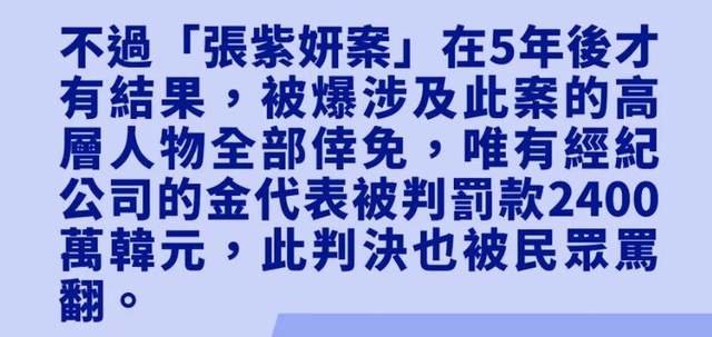 还记得张紫妍案之前的结果吗?2009年曝光的案子直到2018年才重启调查,张紫妍遗书涉及人员全部没有承担任何责任,只有张紫妍经纪公司负责人金代表遭到了罚款。