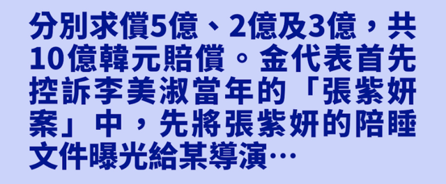 13年时间过去,也正是这位金代表又再次让张紫妍案重回公众视野——2022年9月2日,他针对韩星李美淑、宋善美以及相关部门提出了起诉,共索要10亿韩元赔偿(约合人民币500万)。