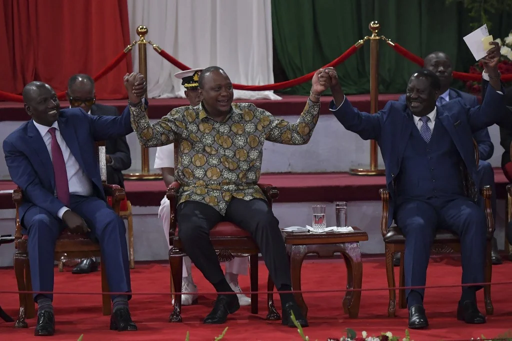 过去15年里左右肯尼亚政局的政治三角:鲁托(左)、肯雅塔(中)和奥廷加(右) / 网络