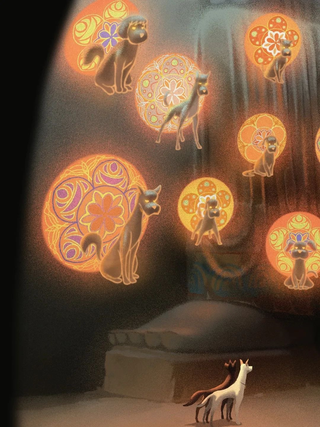 “乐曜、玄兔,你们到这里来……我来向你们介绍守护莫高窟的灵犬成员。禹徵,他跟随张骞从长安来到敦煌;翌翟,他曾为霍去病打败匈奴立下赫赫战功;玄穆,他是李广利将军西征大宛的随军犬;淳胥,他曾在汉代悬泉置驿站服役;舜煜,他是东汉名将张奂的家犬;箜询,曾经为执政敦煌的曹氏家族看守经书,后来他跟随曹全平定了疏勒,壮大了东汉在西域的声威;戴勋,他为张恭之子张就送出了家信,为营救张就立了大功;雎鸢,为曹魏时期的名臣仓慈所用,后守护其祠堂;观崇,他曾陪伴西晋大书法家索靖到过鸣沙山,见证过索靖在仙岩寺题字;冰阳,他曾经随西凉国李派遣的使团出使过建康;曜圣,是他在建元二年等候并协助乐僔和尚开凿了莫高窟第一窟,守护他在此修行;樊鋆,他是接应乐僔和尚与法良禅师的灵犬,莫高窟的营建从乐僔和尚与法良禅师开始,此后连续十个世纪不曾中断;姬彧,他不离隋唐时期的地理学家裴矩左右,助他整理、记录西域各国的山川和风俗,陪伴他撰写《西域图记》;无影,他护送过玄奘法师西去取经;我是禹光,曾经在张议潮的归义军中服役,见证了张议潮收复河西地区,让敦煌回归大唐……”