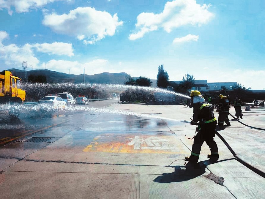 9月24日,山西省高速公路综合行政执法总队太原支队六大队联合太佳高速公路东段运营分公司及高速交警一支队十大队,在太佳高速公路静乐服务区开展车辆突发火灾事故“一路三方”协作处置应急演练,检验了高速公路火灾事故的应急处置和协同作战能力。(杜文军 摄)