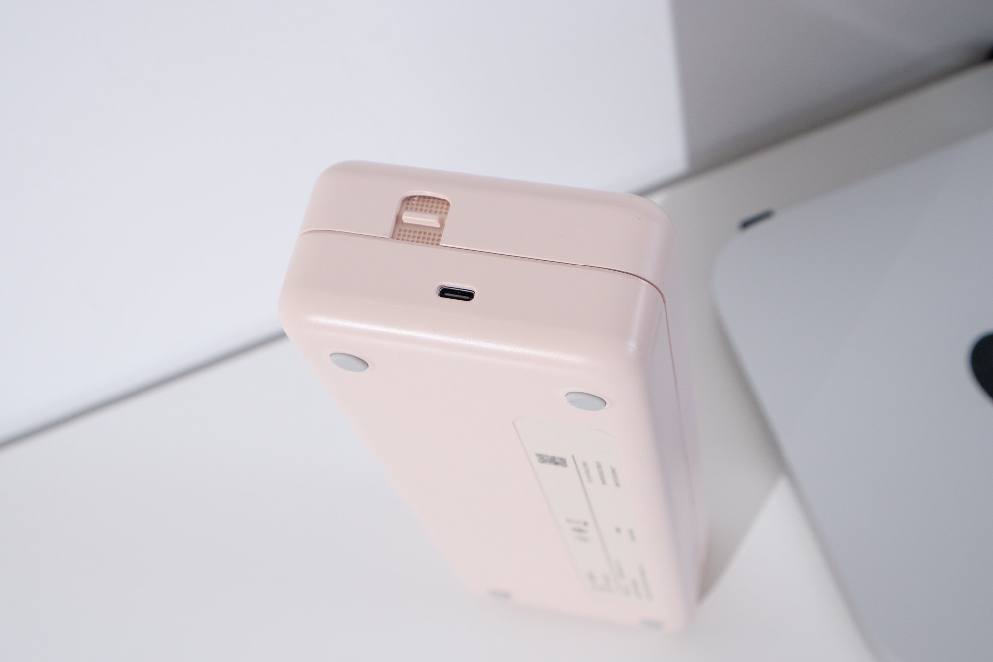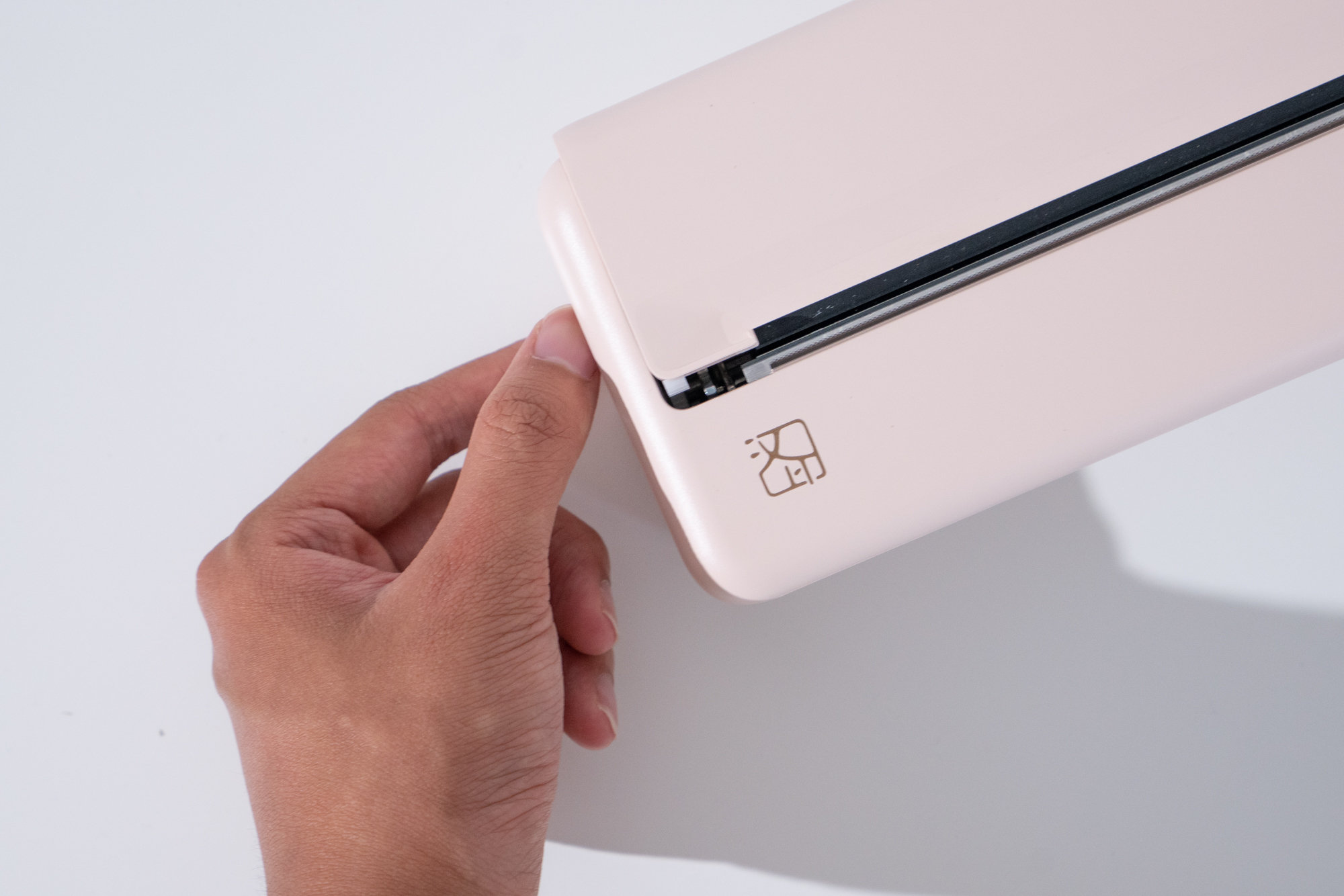 MT810打印机左下角的是品牌的logo,和type-c充电接口。打印机双侧还有打印机纸盒的开盖按键,同时用力按下两个按键,打印机的纸盒盖就能弹开。
