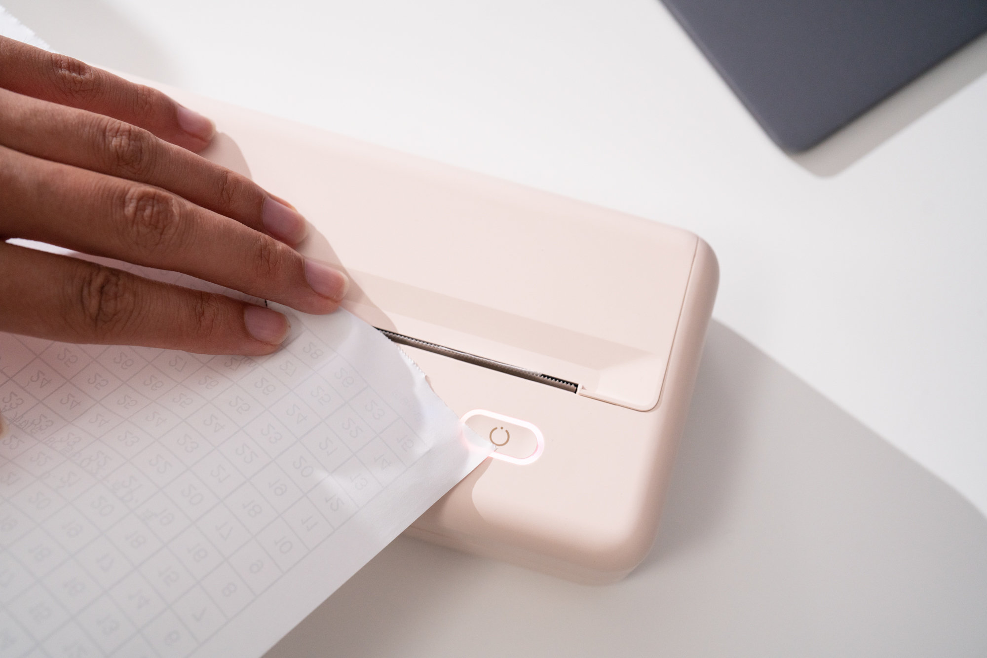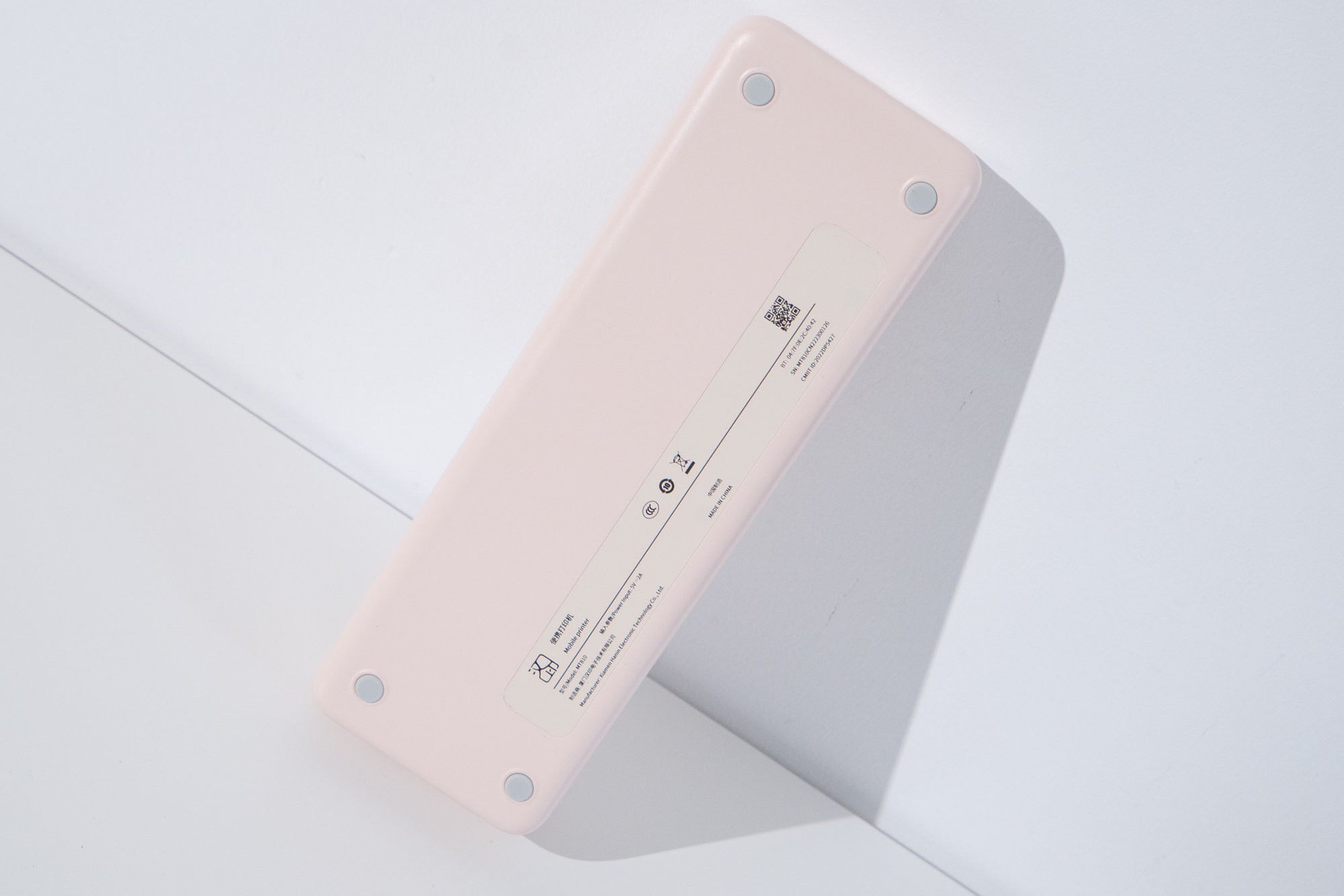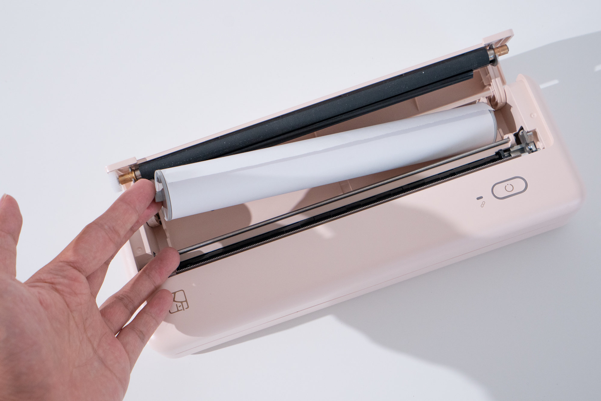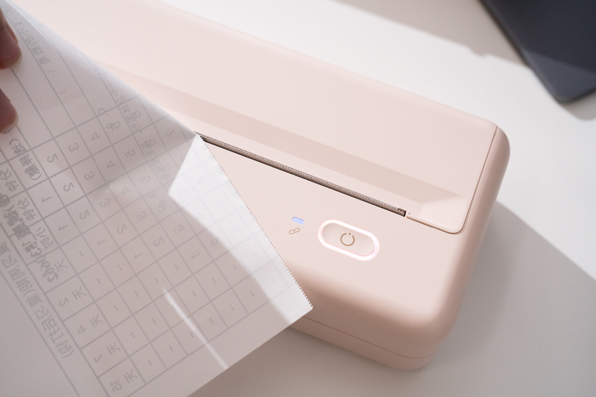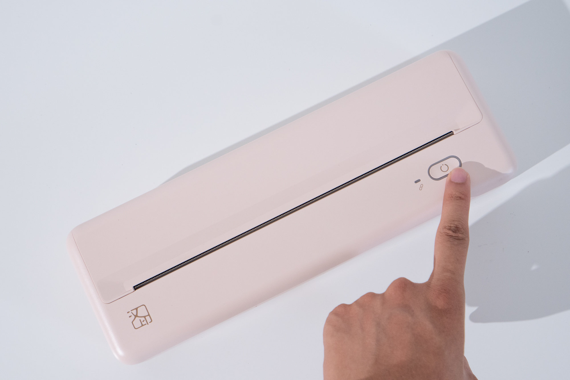 粉色的MT810打印机的开关设置在右下角,同样在右下角的还有蓝牙信号连接感应灯,正确开机连接蓝牙后,开关灯与蓝牙指示灯都会亮起。