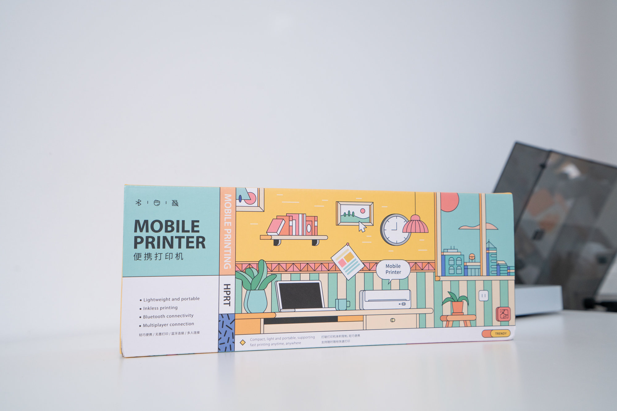 汉印MT810打印机的外包装是莫兰迪色系的漫画配色,这个彩色的插画使整个包装盒都有了生机活力,在包装盒的正面包我们可以看到除了中英文产品名称、产品特色、品牌的logo。