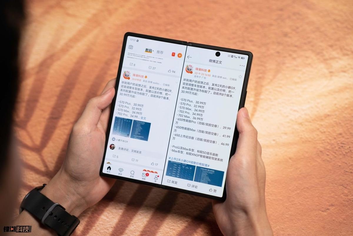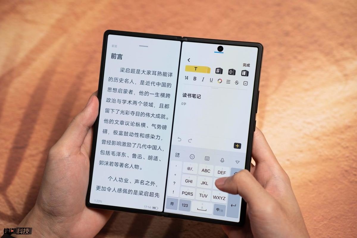 vivo X Fold+ 的内外屏配置可以说非常顶,内屏是一块 8 英寸 4:3.55 的OLED 屏幕,分辨率为 2160x1916,这也是最大尺寸的内屏之一,更大的屏幕让 X Fold+ 能够在同一个页面显示更多的内容。