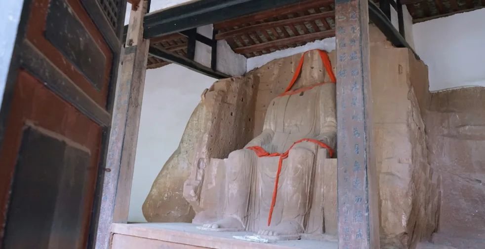 古寺的正殿保存有一尊唐代凿刻的弥勒造像,大佛为坐像,双手放于膝上,和身后的石碑等一样,也刻于自然山体之上。