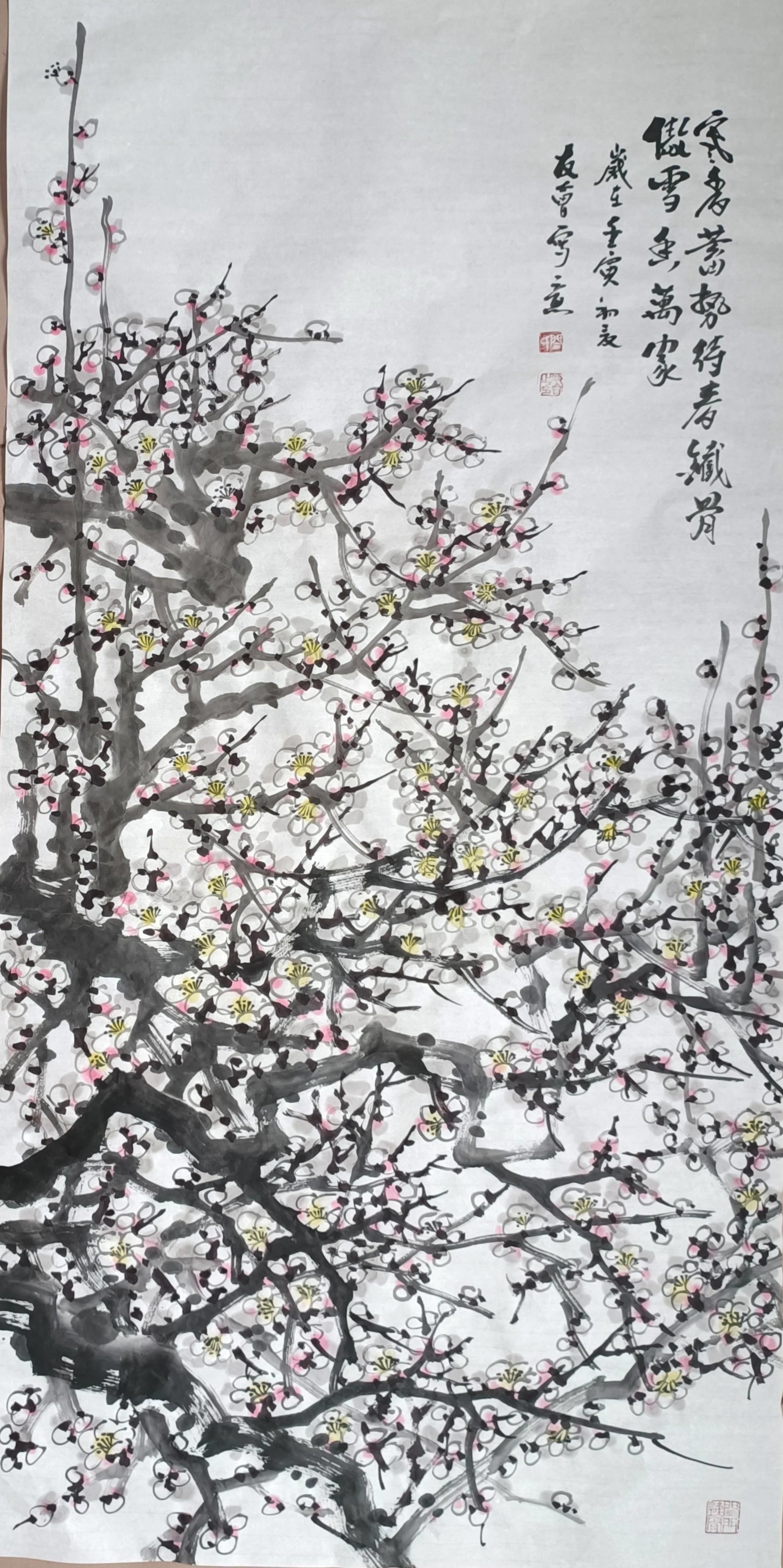 他笔下梅花经由皴擦勾勒,浓点淡抹,既展示了五墨六彩的艺术效果,又画出了梅花粗干老干的蒼劲和细技嫩枝的挺拔,配上揉搓有致的各色梅花,就形成了他梅花作品的鲜明生动、雅俗共赏的风格特!一枝矗向云霄去,万点梅花逸风情。这样的龙骨梅花,尽见中国画的气韵生动,也是骨法用笔、应物象形的经典。挂一件在厅堂必然赏心悦目,蓬荜生辉,可以突跃出令人大振心颜的磅礴气象。龙梅第一笔,功到自然成!中国画讲究外师造化中得心源!闫友会习成画道,除了向古法学习之外,还特别重视取法自然。