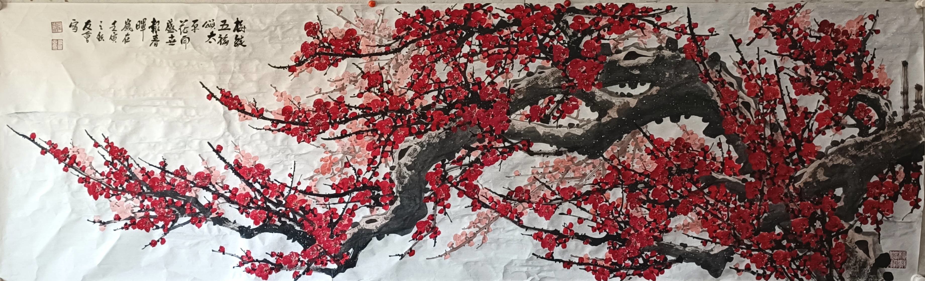 对他来说,画梅的过程,不只是技艺的日臻成熟,而且是他自己品德的提升与意志砥砺过程。闫友会画梅主张创新,追求画面的时代感和生活气息。他画的梅花,不论是红梅、白梅、黄梅或是绿梅,都枝繁花茂,色调饱满,淋漓腴润﹔画中老梅,古拙苍润,横斜奇纵,潇洒出尘,体现了我们的时代精神,形成了鲜明的个人风格;他在画梅中营造了自己的学术支撑点,找到了真正的文化元素,有自然的灵性体现。因此才使作品具有震撼,折射出顽强的生命光彩,达到了振奋人、激励人、启发人的大美效果。