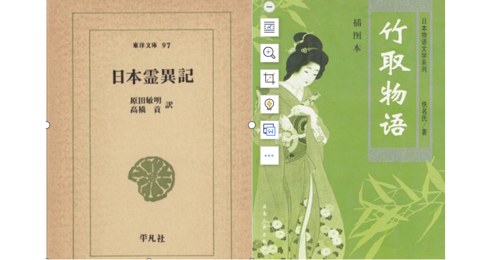 《日本灵异记》和《竹取物语》。《日本灵异记》是日本最早的民间故事集,著者是日本奈良药师寺的僧人景戒,全称《日本国现报善恶灵异记》。《竹取物语》又名《辉夜姬物语》,是日本最古老的物语文学作品,同时也是日本第一部以假名书写的文学作品,作者不详。