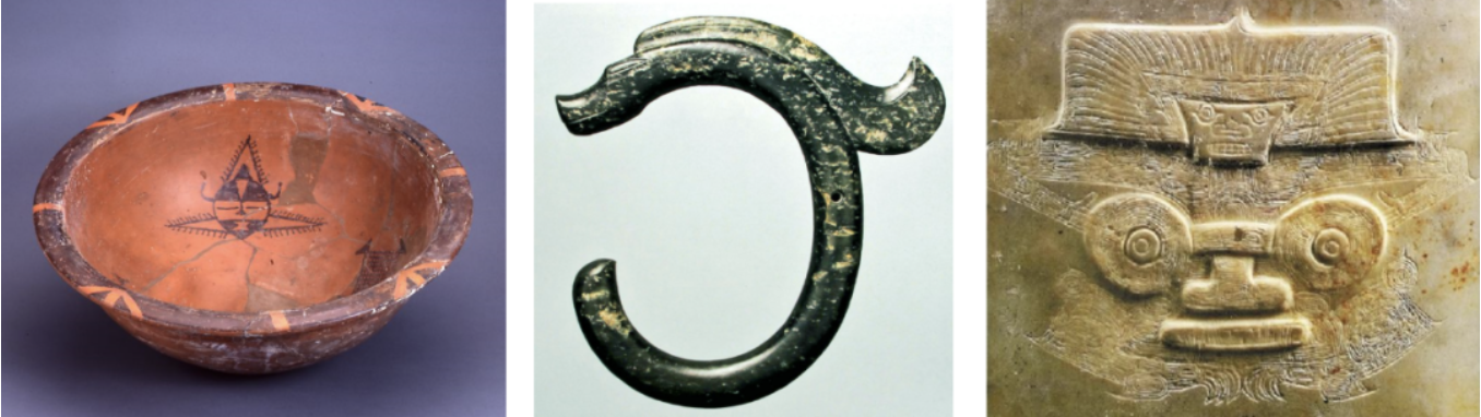 从左到右依次为半坡文化的人面鱼纹盆、红山文化的玉猪龙和良渚文化的神徽像。