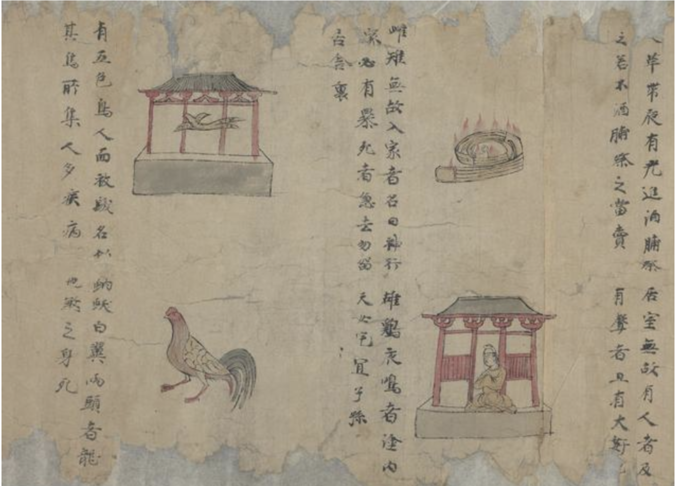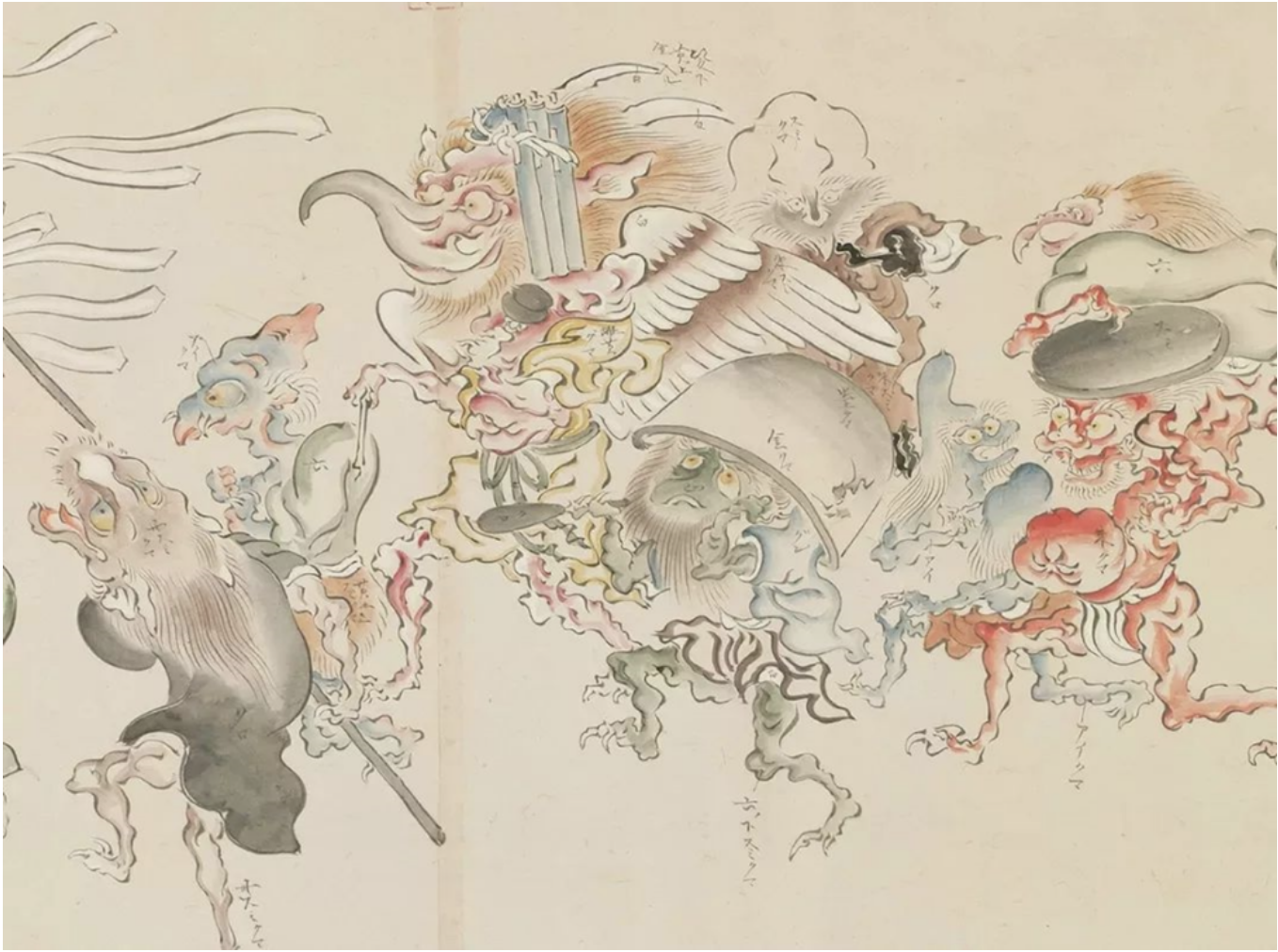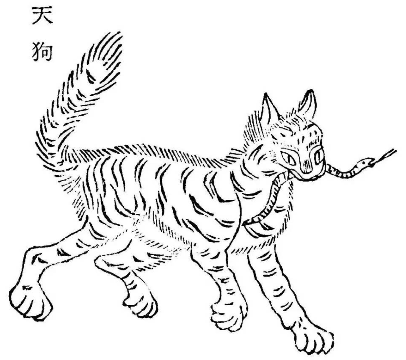 此外,还有一种形态是鸟状怪物。清代有记载说,“康熙壬子四月二十二日黎明,钱塘西北乡有孙姓者,家方育蚕,门尚未启,邻人采桑过其居,见孙屋脊上有一物,似狗而人立,头锐喙长,上半身赤色,腰以下青如靛,尾如篲,长数尺。惊呼孙告之,甫开门,其物腾上云际,发声如霹雳,委蛇屈曲,向西南而去,尾上火光迸裂,如彗之扫天,移时乃息,数十里内皆闻其声,亦有仰见其光者。”(清·东轩主人《述异记》卷中)这和日本的天狗非常像,像狗一样,但是可以站起来,头非常尖,嘴巴非常长,上半身是红色,下半身是青色,尾巴是散开的。