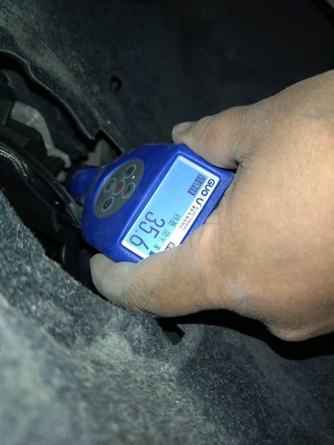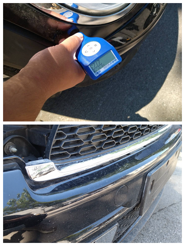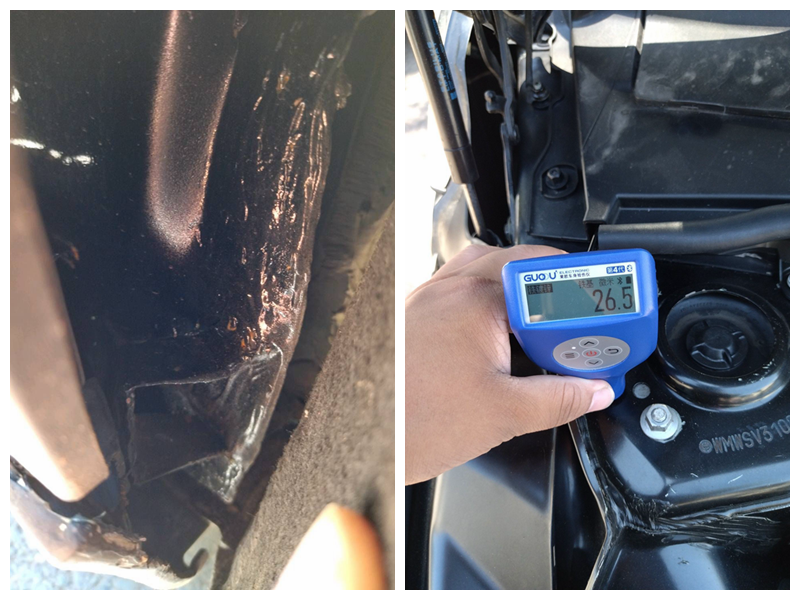 前保险杠更换,固定螺丝拧动过,做工也不好!机盖右前角位置重度钣金,漆面厚度比原厂标准高了20倍不止,里面都是腻子灰啊!照这个情况来看,右前方应该发生过碰撞事故,至于事故的大小还得仔细排查发动机舱里面才能有个大概判断!