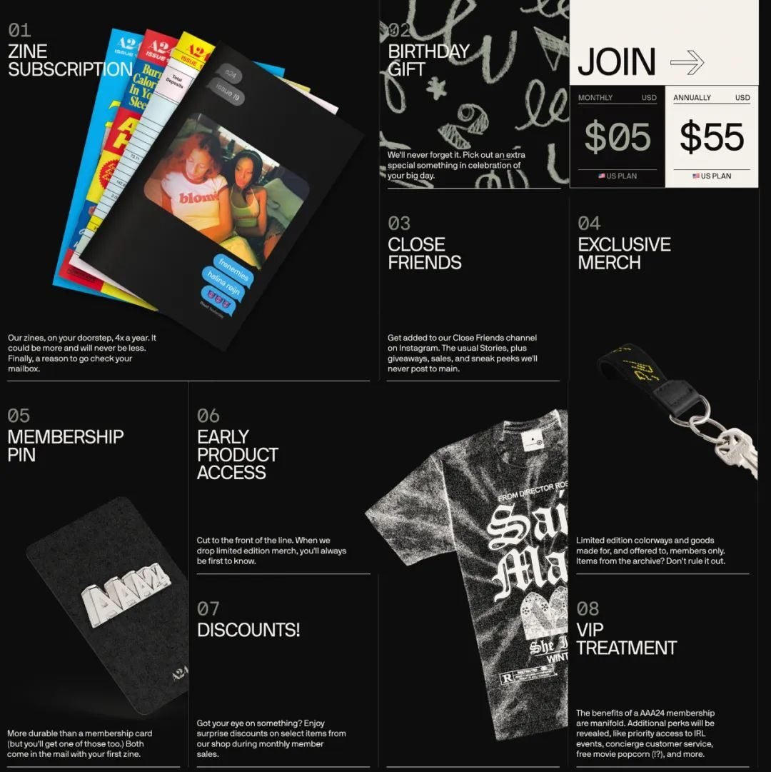 最显而易见的是,A24目前推出了名为「AAA24」的持卡会员体系,会员分为月度与年度两种模式,能够享受杂志订阅、生日礼、私密社群、衍生品折扣、限量周边优先购、免费爆米花等VIP待遇。不只是关于电影,更重要的是生活方式的风格、态度与意义传达——订阅一种生活,体验一个时代。