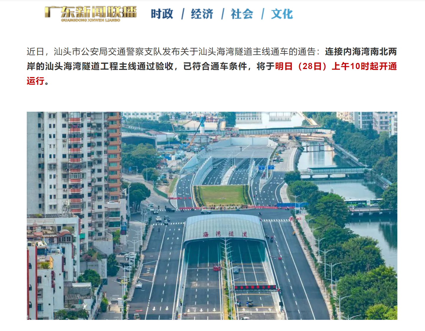 IT之家 9 月 27 日消息,据广东新闻联播今日报道,昨日,汕头交警官方公众号发布了《关于汕头海湾隧道主线通车的通告》,该通告称,近日,连接内海湾南北两岸的汕头海湾隧道工程主线通过验收,已符合通车条件,将于 2022 年 9 月 28 日上午 10 时起开通运行。