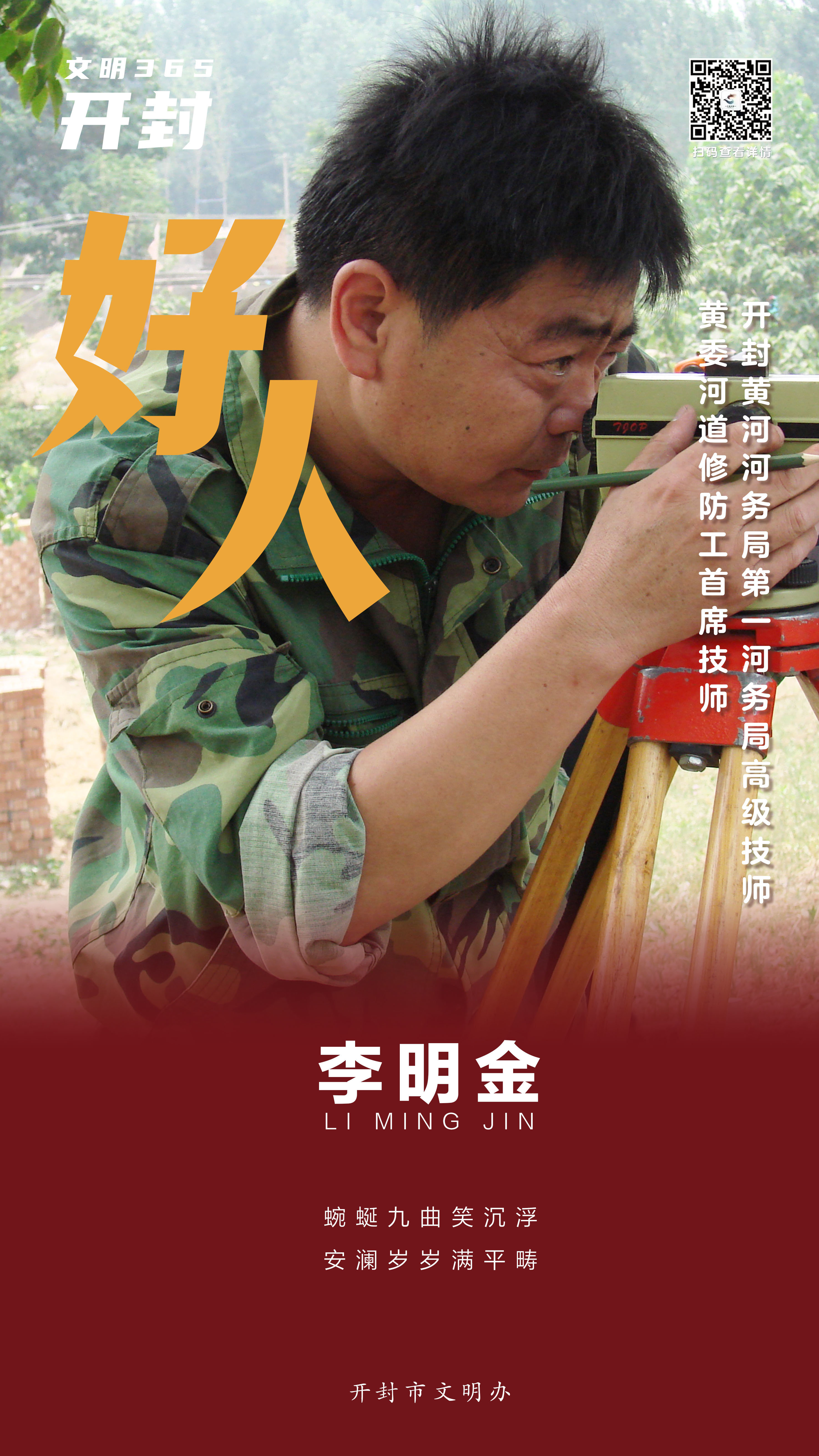 李明金 男,汉族,1967年6月出生,中共党员,开封黄河河务局第一河务局高级技师、黄委河道修防工首席技师。他主持完成的“黄河埽工申遗”课题攻关,被评为“开封市非物质文化遗产”。每年汛期,他都担任首席抢险技术指挥,曾参加或主持黄河开封段800余次黄河工程抢险方案制定及抢护等工作;创建首席技师工作室,通过“学校+工作室”育人活动培训学员达400余人次。