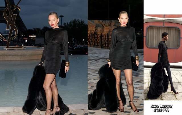 老牌超模Kate moss也是火力全开,选了一套saint laurent2022早秋系列的短裙+皮草的造型,和模特的型录一样,皮草成了她手上的配饰,随意一拍都是大片,这一套贵气又气派。