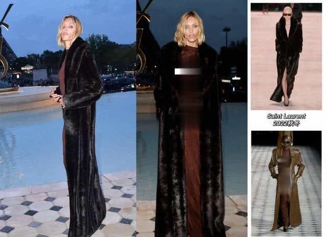 超模“安公子”Anja Rubik作为品牌创意总监Anthony Vaccarello的灵感缪斯,直接上身了秀场同款透视连衣裙,大牌皮草长外套亮相,Anja的潇洒性感,慵懒迷离感和圣罗兰的适配度拉满,她是圣罗兰的人形广告牌,是“行走的圣罗兰”的完美写照!