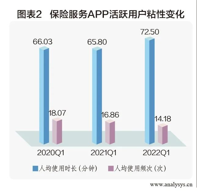 从用户粘性看,保险服务APP活跃用户人均使用时长从2020年一季度的66.03分钟,增加至2022年一季度的72.5分钟,人均使用频次同期从18.07次下降至14.18次(图表2)。
