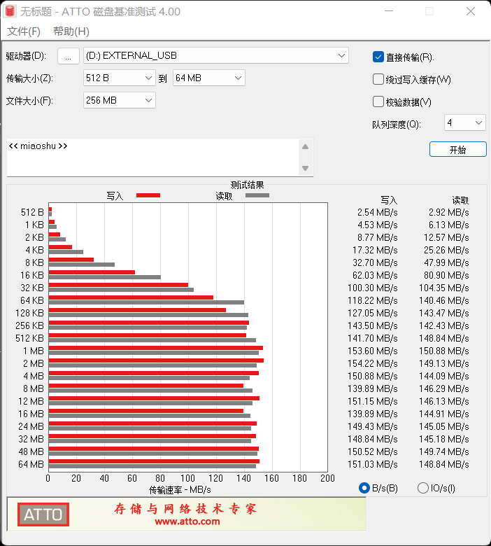 使用ATTO磁盘基准测试,可以看到东芝Partner(PT)的最高写入速度为154MB/s,而最高读取速度为150MB/s。