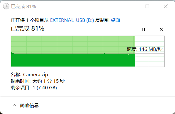 我们准备了约40GB大小的压缩包,通过测试可以看到从东芝Partner(PT)拷贝文件到笔记本上,速度虽有小起伏但总体比较平稳,读取速度基本都能够维持在145MB/s左右,读取40GB的压缩包总耗时约4分45秒。