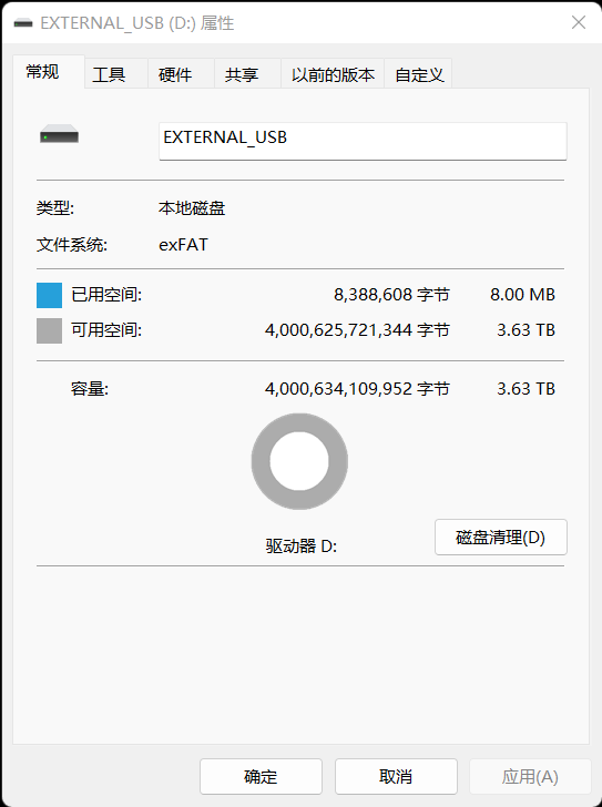 将东芝Partner(PT)连接到笔记本,可以看到4TB的硬盘实际可用空间为3.63TB,并且文件系统为exFAT格式。