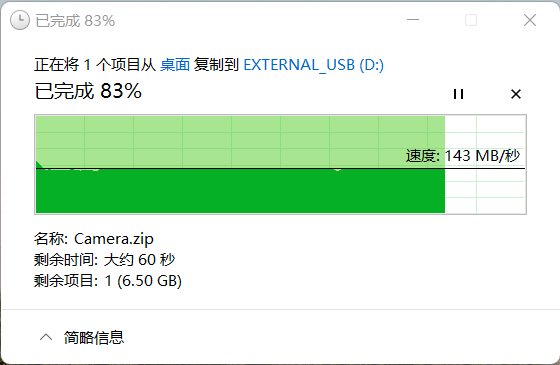从笔记本将文件拷贝至东芝Partner(PT)考验的是硬盘写入性能,经过测试东芝Partner(PT)的文件写入可以达到143MB/s,全程也是十分稳定几乎没有任何波动,最终用时则是4分50秒。
