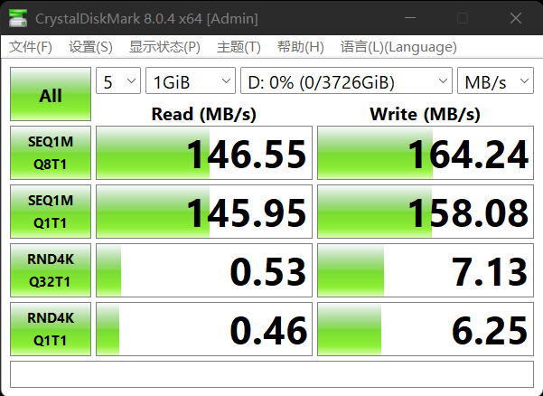 接下来我们对东芝Partner(PT)进行软件跑分测试,使用CrystalDiskMark进行测试,可以看到硬盘的顺序写入速度为164MB/s,而顺序读取速度为146MB/s。