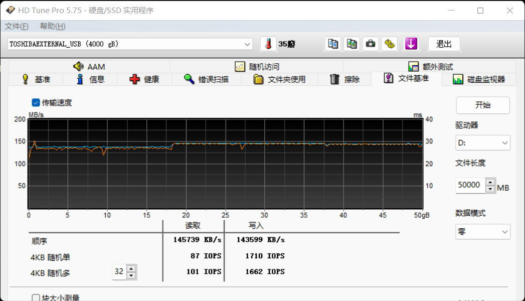 使用HD Tune Pro测试,以50GB大小的测试文件查看硬盘的持续读写性能表现,可以看到东芝Partner(PT)的持续写入约为143MB/s,持续读取约为145MB/s,有意思的是在大约18GB的测试后,硬盘的读取和写入速度似乎还略微提升了一些。