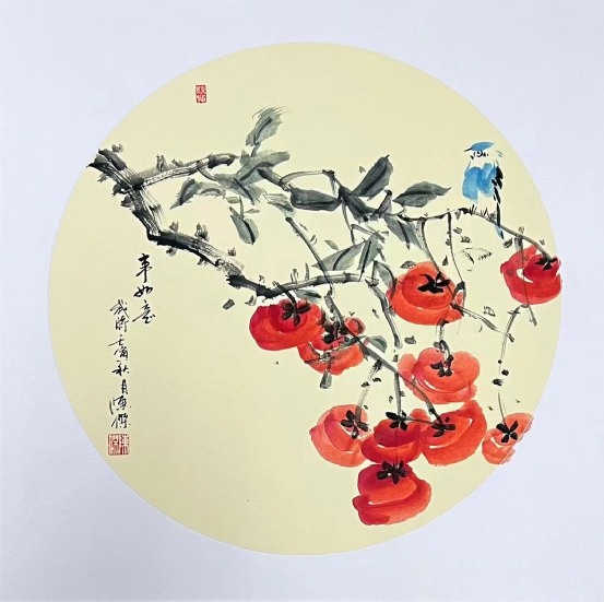 此幅作品以“柿子”为题材,“柿子”呈扁圆形,“柿子”红润饱满充实,似灯笼,似火炬,硕果累累,丰收在望,一只伶俐的鸟儿又给画面增添和谐动感,让人有一种赏心悦目的感觉,寓意红柿子当头、事事能够如意。