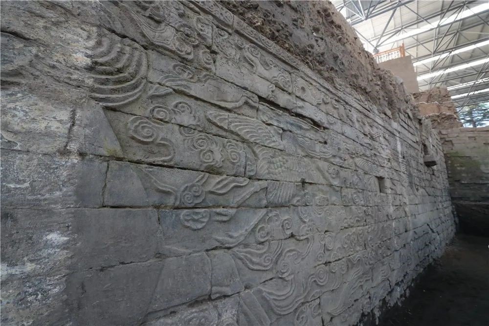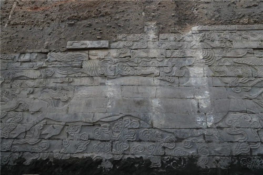 本次考古发掘,最重要的发现是在州桥东侧的汴河河道两岸发现有大型浮雕石壁,其上雕刻有海马、仙鹤、祥云等,一匹海马、两只仙鹤为一组,目前两岸各发现三组。北侧石壁顶部距地表深约5.5米,底部距地表深约12米,石壁高约6.5米,东西长约22米。石壁的建筑方法:从目前发掘情况得知,最底部至少为两层方木,上窄下宽铺垫,方木以上先用六层素面青石条错缝垒砌,再上为16层雕刻有纹饰的青石条平放错缝垒砌,青石条规格不一,条石之间似用特殊材料砌粘,极其坚固。从下向上算起,自第七层开始每块青石上均有编号,如“坐十二、坐二十”“上十五、上二十二”,“上十七、士十八”“由十八、山十六”,编号前的汉字取自古代习字课本中的句子,如“上士由山水,中人坐竹林,王生自有性,平子本留心,王子去求仙,丹成入九天,山中方七日,世上几千年。”南侧石壁与北侧基本相同,石块编号使用《千字文》中的“天地玄黄、宇宙洪荒、日月盈昃、辰宿列张”等。因为宋代汴河石壁被明代后建的州桥雁翅遮盖,考古工作者根据与州桥的距离推测,宋代汴河石壁图案每侧应为4组。