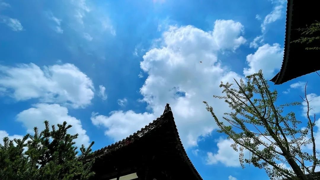 靠近观音向上仰视,湛蓝的天空中白云悠悠,让人产生观音在“动”的感觉。