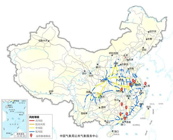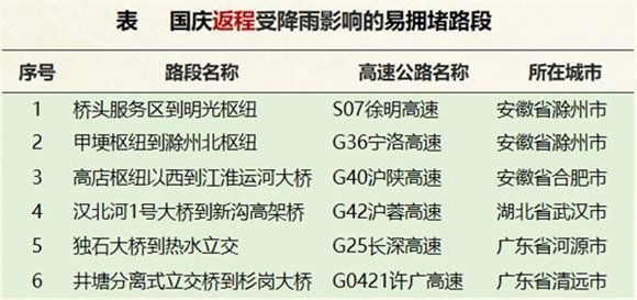 5日至7日返程高峰时段,安徽、湖北、广东境内的易拥堵路段降雨灾害风险等级为中到较高,影响通行效率。
